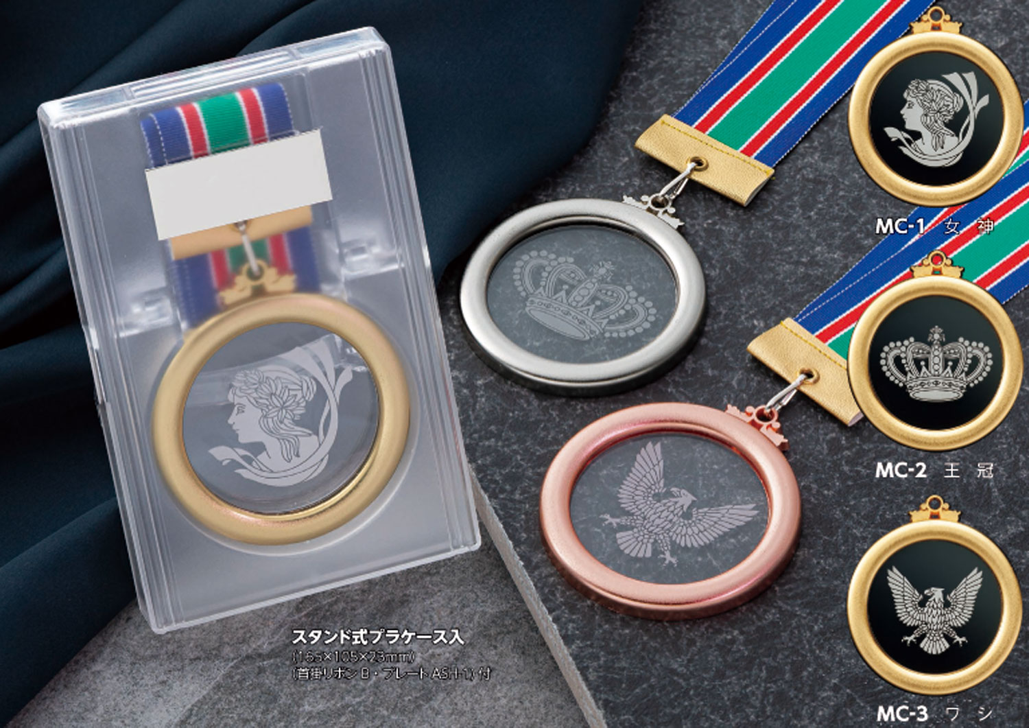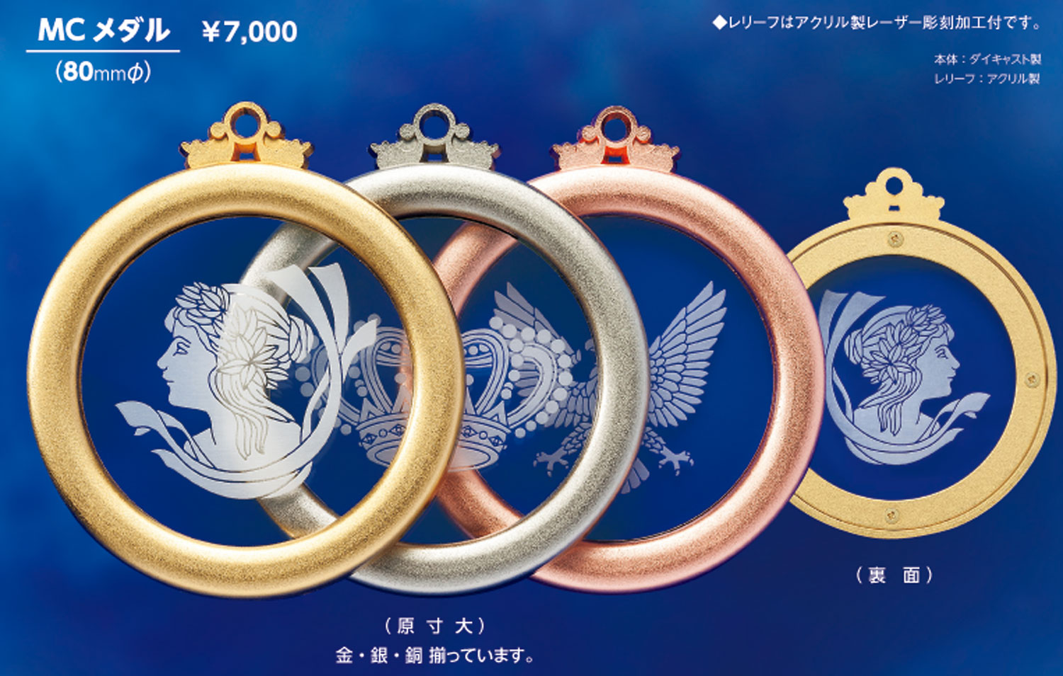 本体:ダイキャスト製/レリーフ:アクリル製(レリーフはアクリル製レーザー彫刻加工付です) ご注文の際はメダル本体の色(金・銀・銅)と図柄をご指定ください