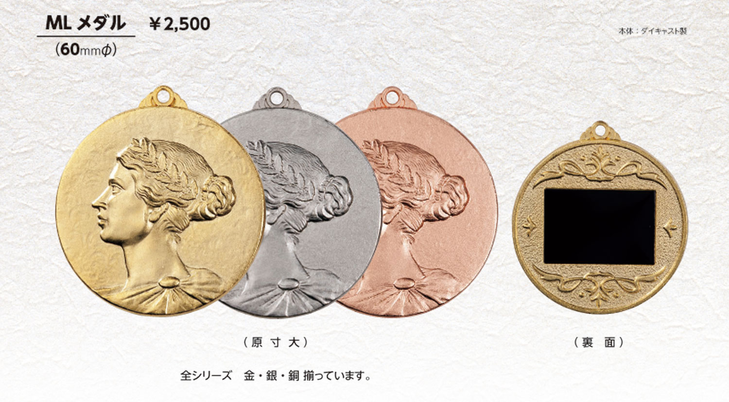 本体:ダイキャスト製 ご注文の際はメダル本体の色(金・銀・銅)と図柄をご指定ください
